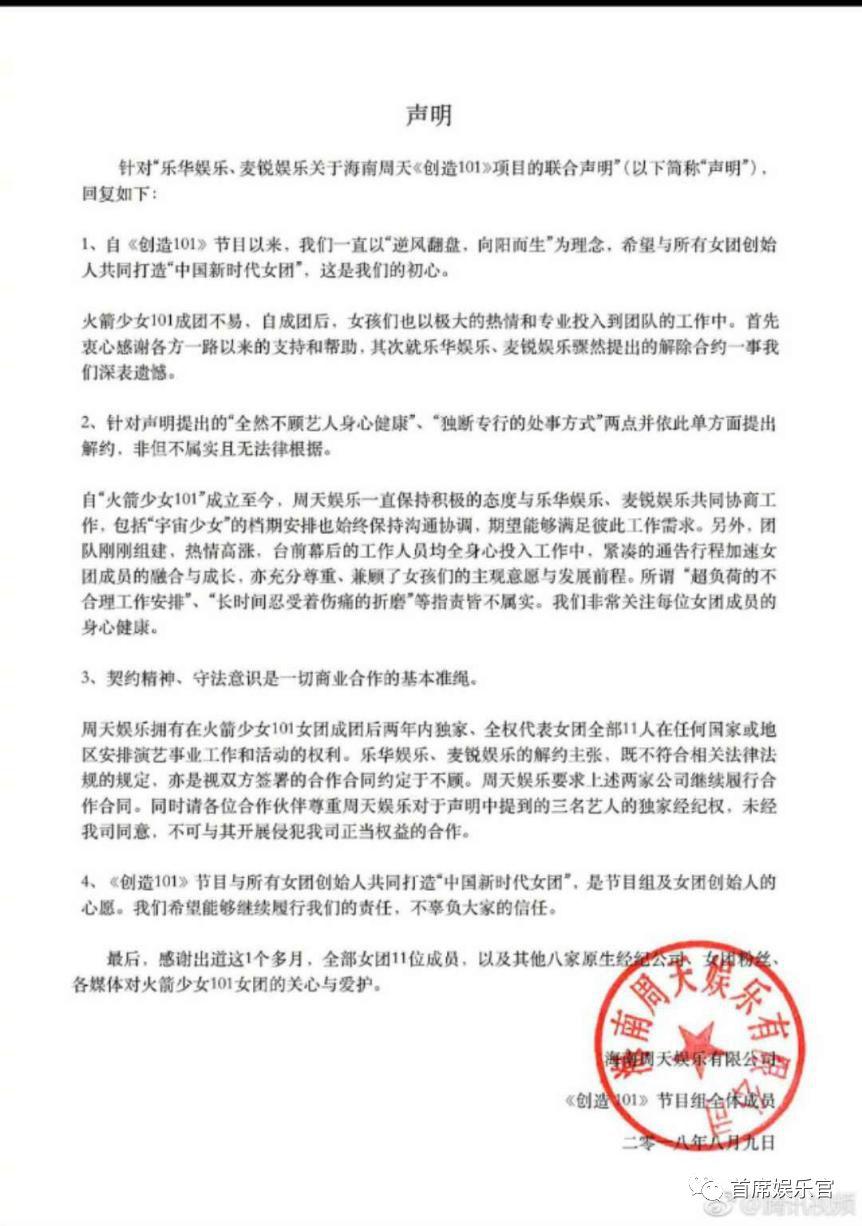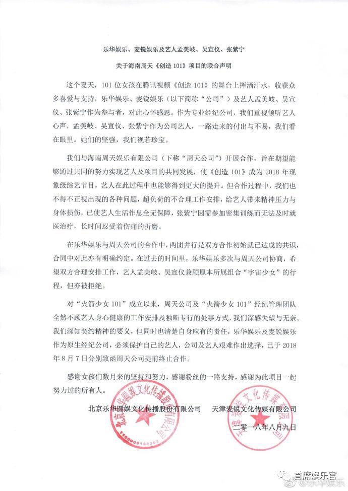 8月9日下午,乐华娱乐官方微博发布一则联合声明,内容显示乐华娱乐、麦锐娱乐两家经纪公司为保护自家艺人,已于2018年8月7日分别致函海南周天公司,提前终止合作。这也就意味着乐华娱乐旗下的两位艺人孟美岐、吴宣仪和麦锐娱乐的艺人张紫宁打算退出《创造101》选秀综艺出道的火箭少女组合。