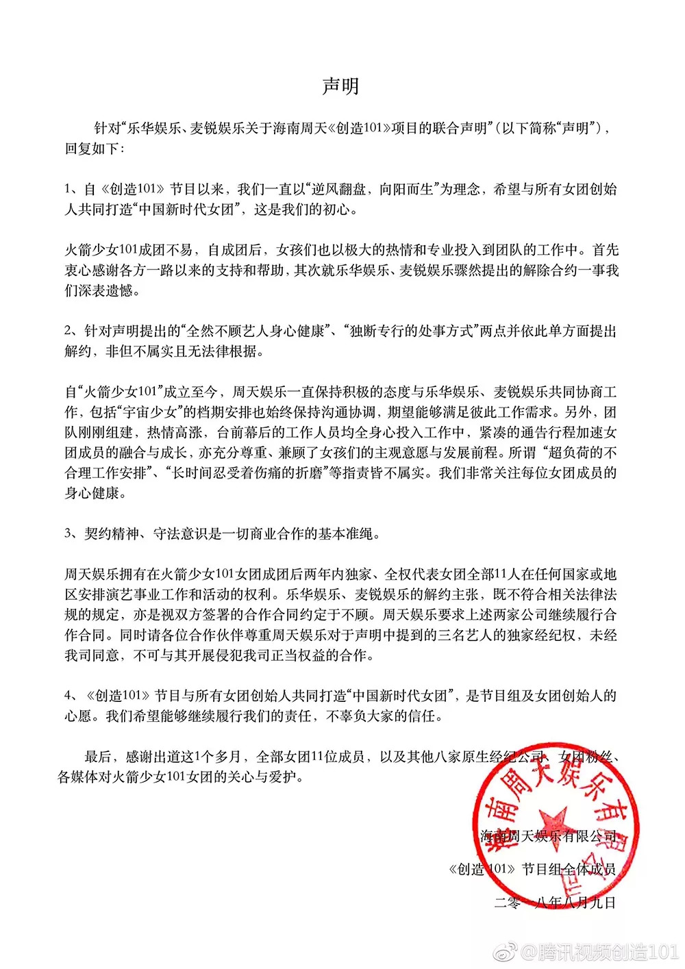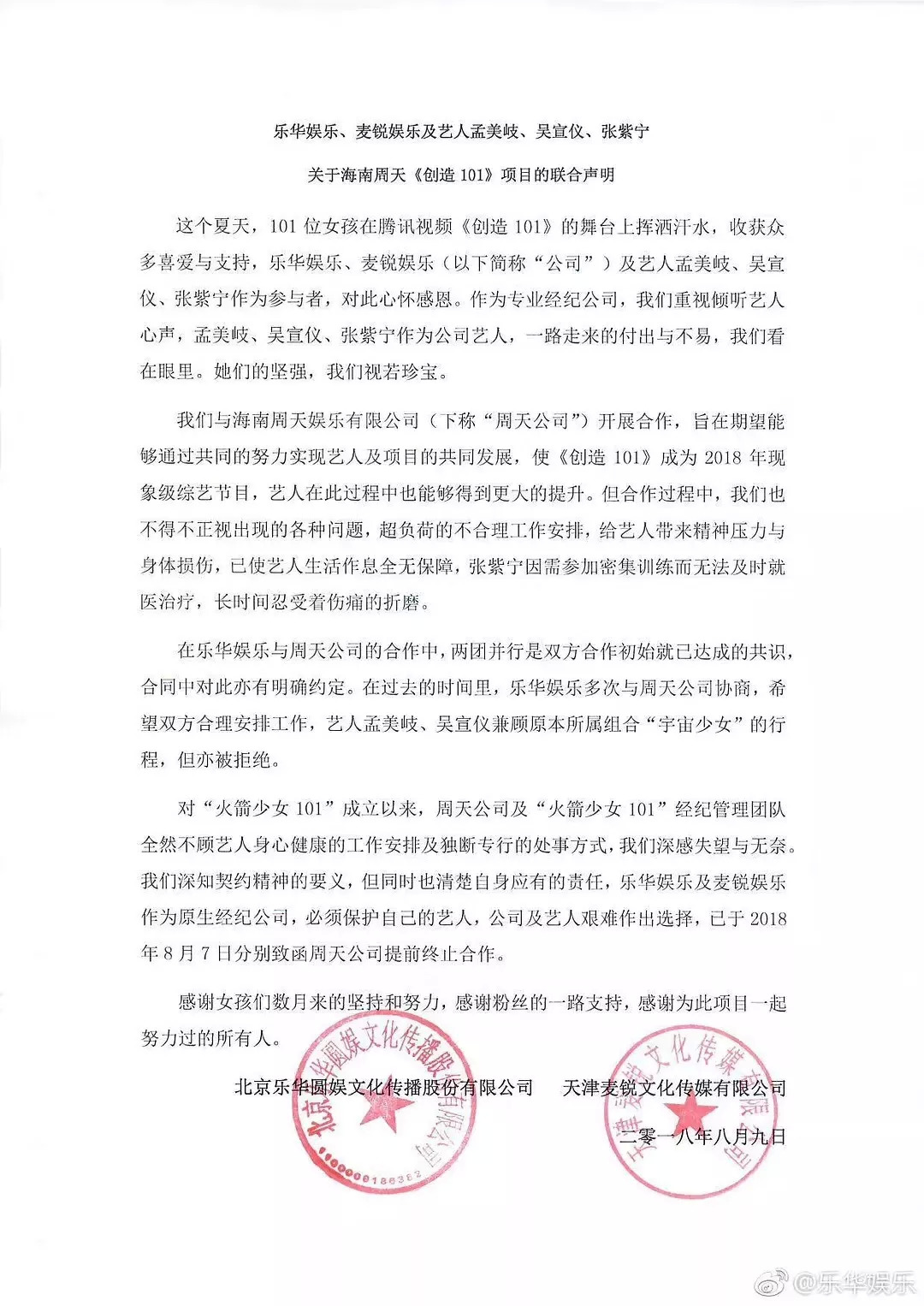 火箭少女101出道以后几次传出解散传闻,昨天下午一点,乐华娱乐和麦锐娱乐的一则联合声明再次掀起讨论:由于对方超负荷的工作安排,孟美岐、吴宣仪、张紫宁将退出火箭少女101女团,提前终止与海南周天公司的合作。
