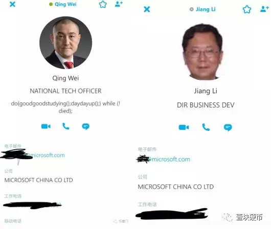 在《HitChain黎江:微软中国CTO的身份涉嫌造假》文中,也将两人的个人信息做出了对比,韦青的职位是National Tech Officer,国家技术官。而黎江的头衔则是DIR BUSINESS DEV,应该是商务拓展主管或者总监。
