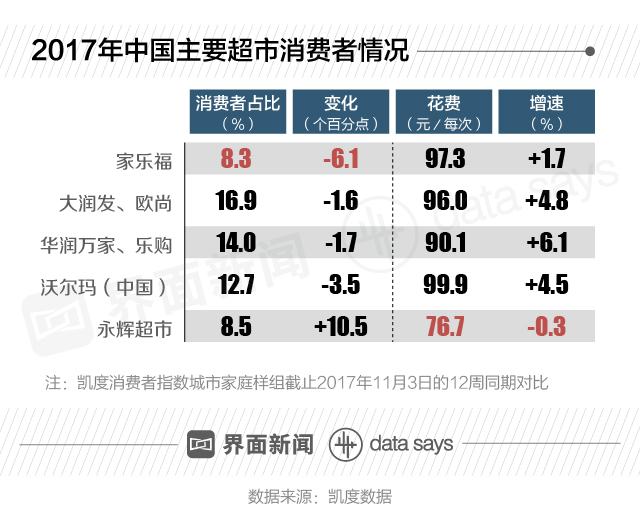 从2017年的消费者数据来看,家乐福消费者占比8.3%,减少6.1个百分点,远低于大润发、欧尚等。
