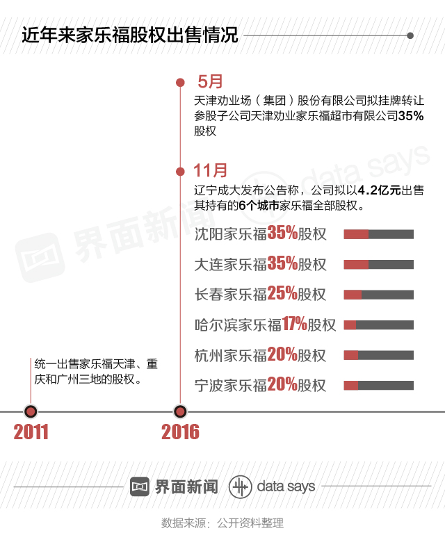 据界面数据(公众号ID:tuli_shuju)梳理,2011年、2016年家乐福中国部分地区公司均有过股权出售情况。