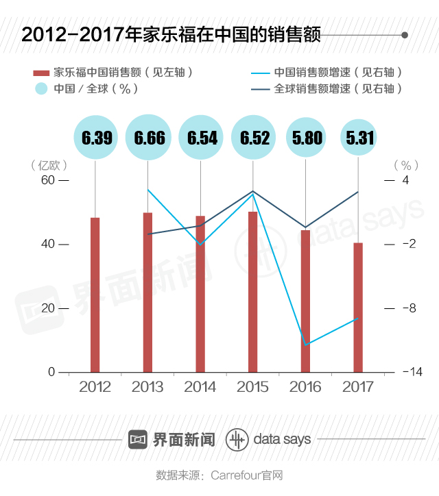 从2012-2017年总体趋势来看,家乐福中国销售额全球占比连年下跌。其中,在2016年,家乐福中国的销售额增速跌至-11.43%,远低于全球水平。