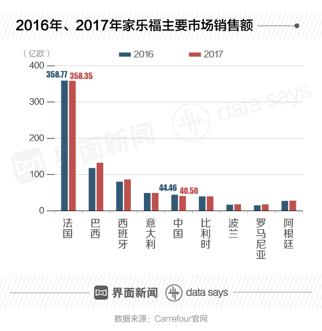 家乐福官网显示,对比2016和2017年家乐福全球各大区销售额数据,中国和法国的销售额均呈下降趋势。其中,中国地区销售额下降共计3.96亿欧元,跌幅最大,远超法国。