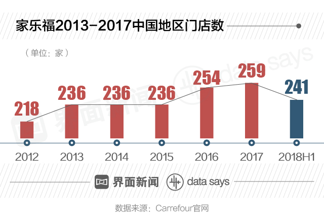 家乐福官网数据显示,2018年家乐福门店数减少至241家。