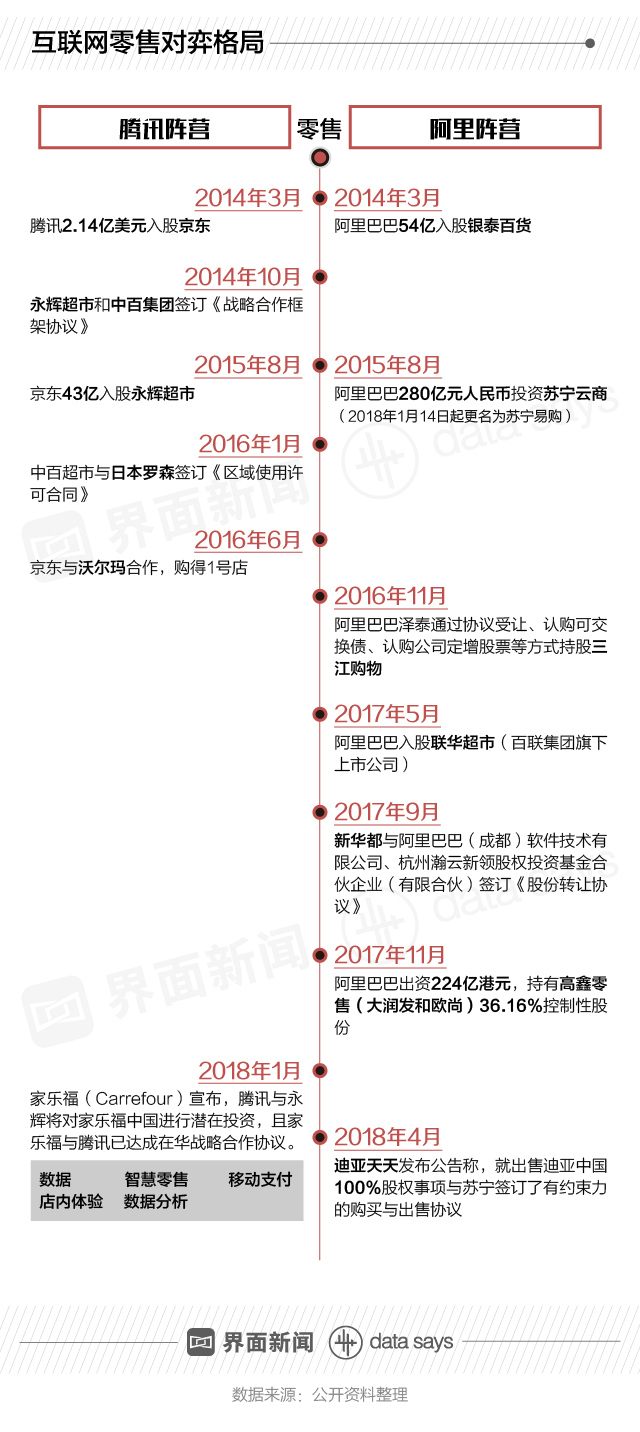 2018年1月23日家乐福(CARR.PA)发布公告称,家乐福与腾讯(00700.HK)已达成战略合作协议,且腾讯与永辉(601933.SH)将对家乐福中国进行潜在投资。时至今日,尚未有具体投资进展被批露。