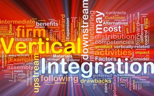 垂直整合(Vertical Integration): 一个产品从原料到成品,最后到消费者手中经过许多阶段。如果一个公司原本负责某一阶段,当公司开始生产过去由其供货商供应的原料,或当公司开始生产过去由其所生产原料制成的产品时,谓垂直整合。