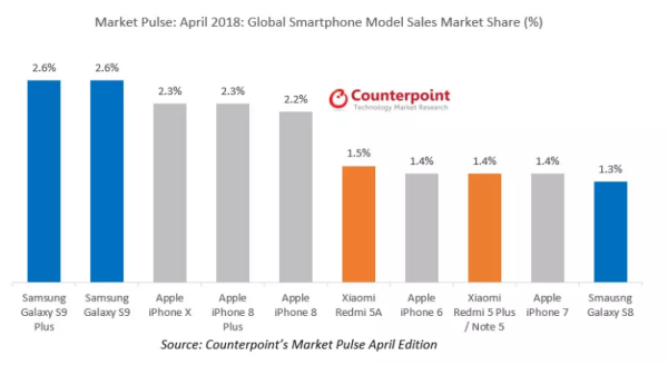 即使在决定手机企业综合实力的顶级旗舰领域,根据Counter point 公布的数据显示,三星Note 8在2017年上市后的两个月,就凭一款机型占据了当月全球手机2.4%总销量,位居全球安卓手机第一位,并且还是真正旗舰机的定位和价格。在今年Galaxy S9发布后,虽然销售数据相比S8有所下降,但上半年的单款总销量依旧接近2000万部,甚至今年3月全球销量一度超越iPhone X,占比当月全球智能手机总销量的2.6%。