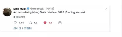 本周,马斯克的推文再次惊呆了大家。“我考虑以$420的价格将特斯拉私有化,资金已经落实”。之后,马斯克又向其投资者和全体员工发了一封内部公开信,称其确有私有化特斯拉的打算,只是尚未最终决定。(私有化是指控股股东把小股东手里的股份全部买回来,扩大已有份额,最终使这家公司退市。马斯克之前表示上市降低了特斯拉的运营效率。)