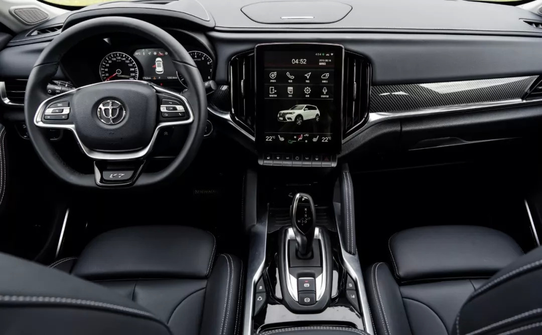 如何在有限的成本下尽量的展现车内的豪华感?中华V7在中空台的设计上采用了三种材料拼接,大面积的棕色皮革,配上碳纤维纹理饰板,再加镀铬条的点缀,让整台车的档次感瞬间提升。对了,扶手箱上的与宝马手感一样的换挡杆一定会满足你的虚荣感。