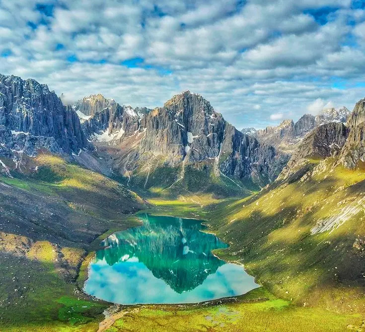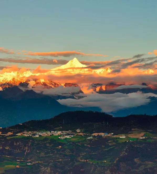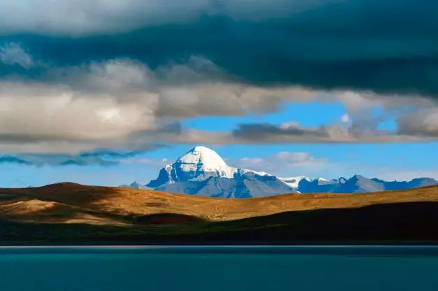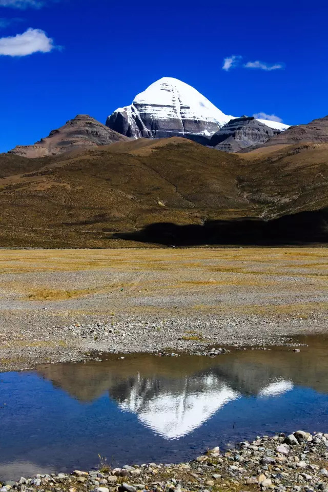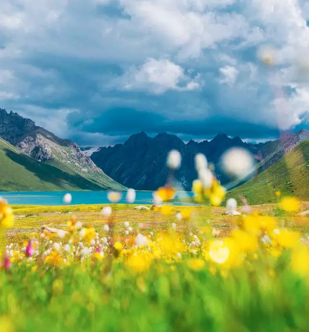 倒映着雪峰,湖畔开满了鲜花。