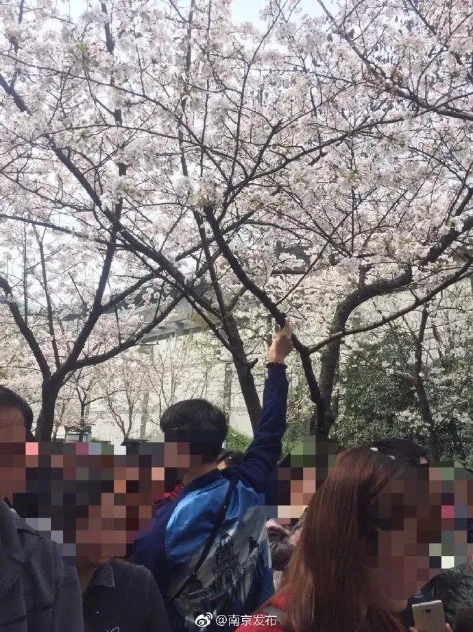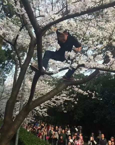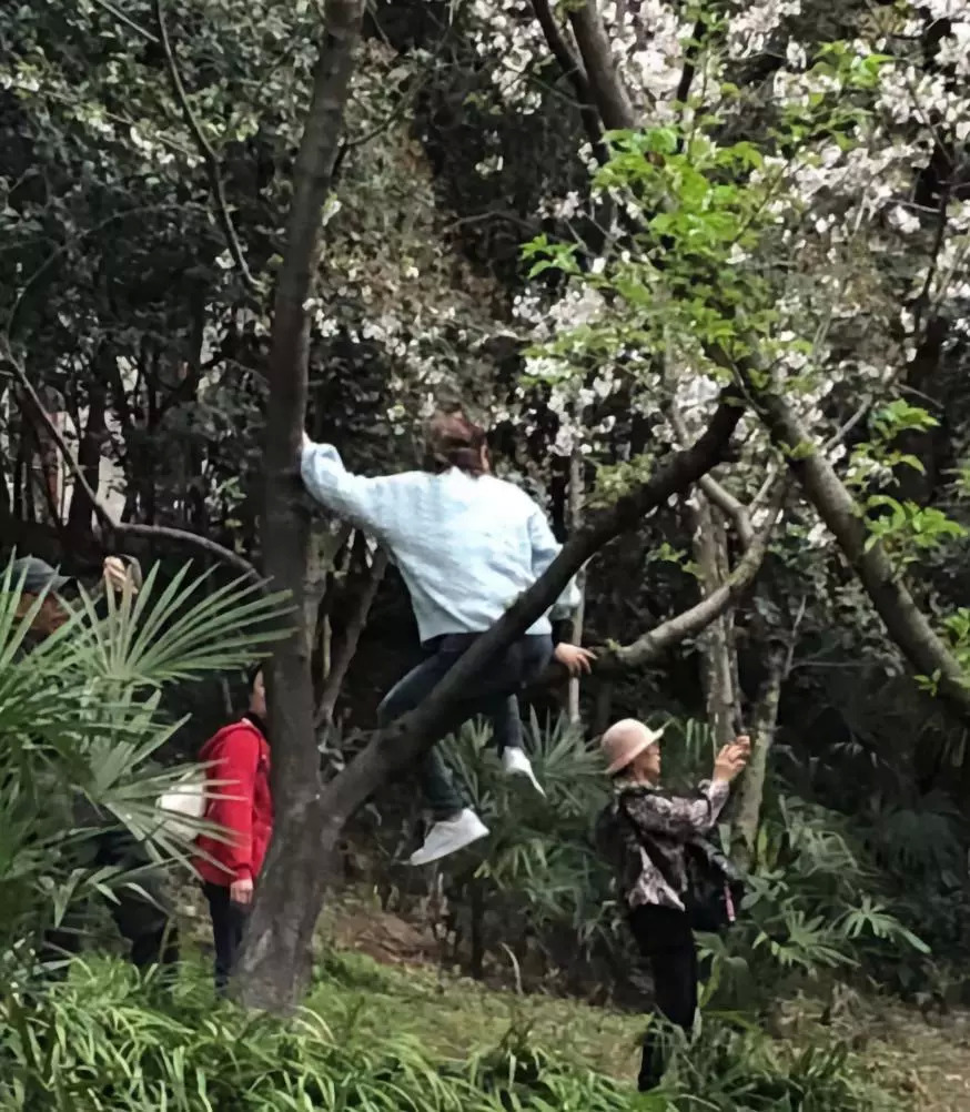 许多游人用脚踹樱花树、爬树拍照,