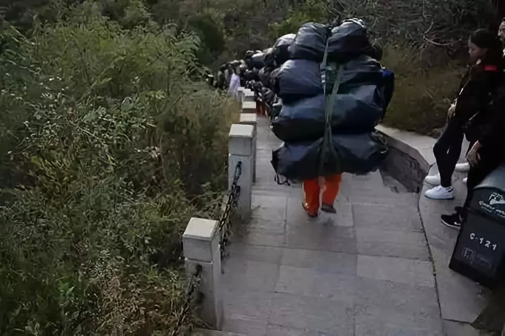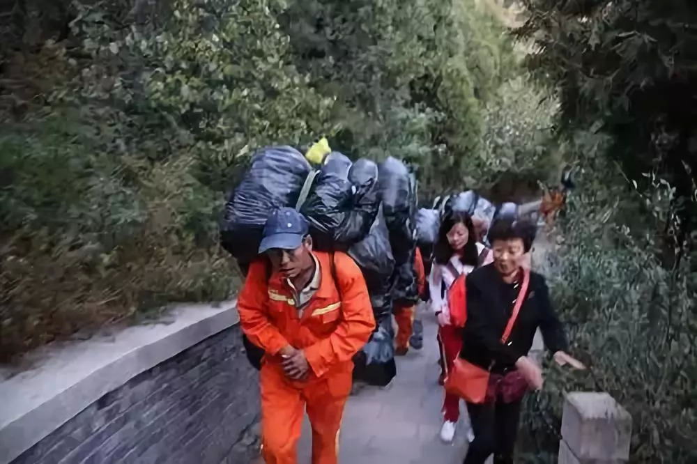 而这些垃圾都得靠清洁工背下长城。