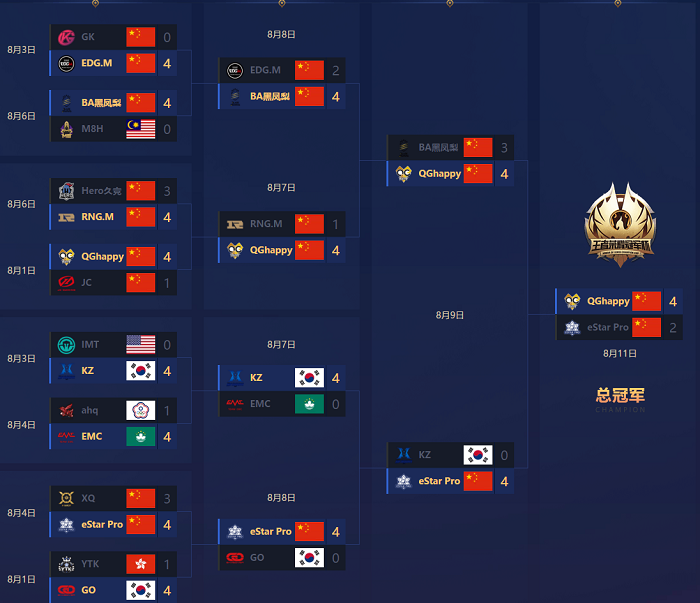8月11日,《王者荣耀》冠军杯国际邀请赛总决赛在北京工人体育馆落下帷幕,QGhappy战队以4:2的比分击败了eStarPro战队,再次夺得了总冠军。