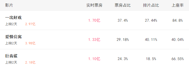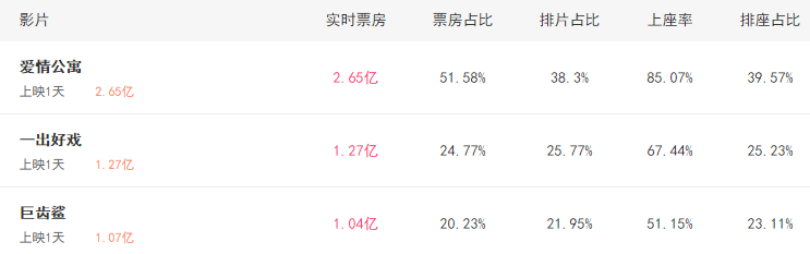 首映日当天,《一出好戏》排片率比《爱情公寓》低13个点,票房被超出一倍多,上座率也输人一头。