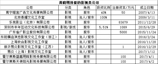 还有一家公司叫东阳易星传媒有限公司(名下控股6家子公司),2007年注册,黄晓明的母亲张素霞担任法人并100%控股,主要投资黄晓明主演的一些电影,有记录的比如《无问西东》、《微微一笑很倾城》、《王牌逗王牌》、《玛德2号》。