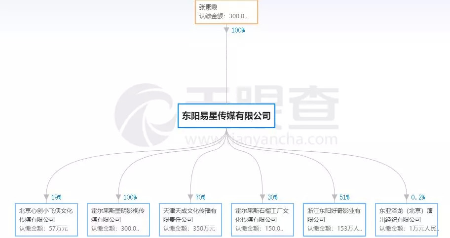 其他注册在浙江东阳横店、江苏新沂、新疆霍尔果斯的几个影视公司,或许是为了获得税收优惠。比如霍尔果斯盛嘉明晖影视传媒有限公司和霍尔果斯天使阳光影视传媒有限公司,都是2017年4月才成立,霍尔果斯是有名的避税胜地,很多明星和影视公司这两三年内都去那儿注册了“皮包公司”。