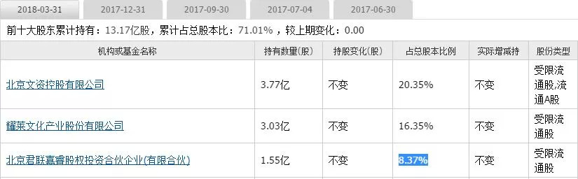 第一类比如北京君联嘉睿股权投资合伙企业。这是华谊兄弟原来的几个明星股东李冰冰、冯小刚、黄晓明,加上张国立,一起持股的一个投资公司,在2014年文投控股借壳松辽汽车的交易中,君联嘉睿参与,后来,君联嘉睿也就成了文投控股的股东,文投控股的控制股东是北京市国有文化资产监督管理办公室,旗下有耀莱影城、耀莱影视,以及都玩网络等资产。