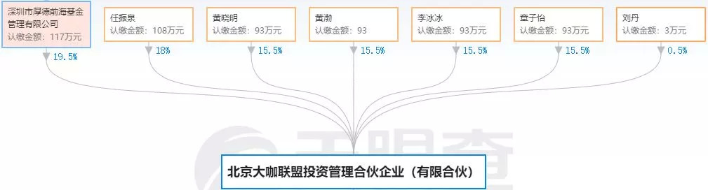 第二类是StarVC,也即北京大咖联盟投资管理合伙企业,当初任泉(原名任振全)、李冰冰、黄晓明各占比30%组建的风投公司,后来加入了章子怡、黄渤,以及持最大股比的深圳市厚德前海基金管理有限公司。黄晓明持股比例被稀释到15.50%。