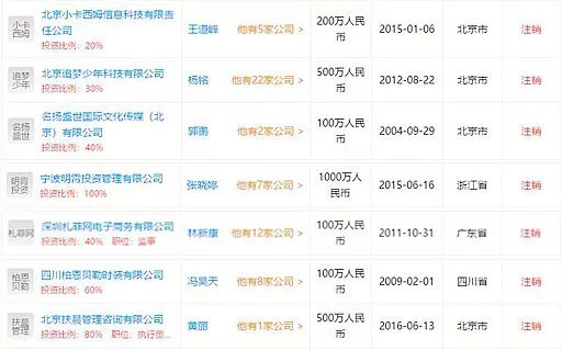 还有那些已注销的公司,比如四川柏恩贝勒时装有限公司、深圳札菲网电子商务有限公司、北京追梦少年科技有限公司、北京小卡西姆信息科技有限责任公司,可能都是黄晓明曾经投资失败的案例。