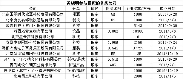 黄晓明还作为直接投资人入股过不少公司,包括做餐饮的北京良友名都、有明堂,做服装的韩都衣舍,做影视周边产品和游戏的丰年互动,做能源的北京国能时代,做饮品的湘西老爹生物(果王猕猴桃果汁)、做护理产品的青岛明悦仁洲实业(ah),以及科技类公司北京星云梦科技(颜值等社交APP)、安徽中视网络科技(中国视频娱乐网)、北京聚创家园网络科技(聚创APP)、数岩科技(数字岩心分析解决方案提供商)、北京易炎科技。