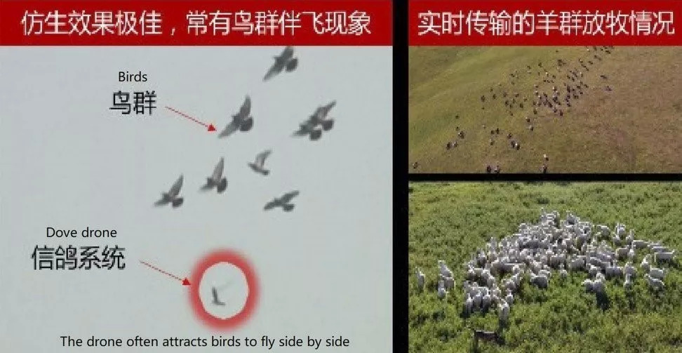 在内蒙古地区进行的一项实验中,研究人员让“鸽子”无人机飞过一群绵羊,绵羊的听觉非常敏锐,极容易受到惊吓,但在实验时,羊群根本没有注意到头上飞过的无人机。