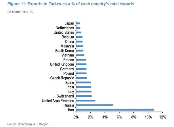 但是从另外一个角度则应该考虑与土耳其的贸易对于相关国家的重要性。从摩根大通整理的数据上可以看出,在贸易上相对脆弱的实际上是该地区其他的新兴市场国家。
