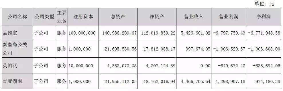 除了收购映客失败,宣亚国际自身的业务也没有很强的盈利能力。半年报数据显示,公司主要的子公司共计4家,其中仅一家净利润达到97万,其余三家累计亏损超800万。