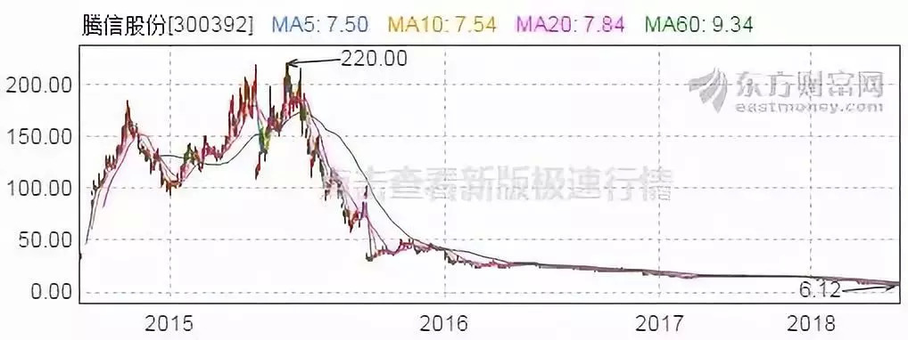 2014年,腾信股份以150元/股的股价冲上第一高价股,2015年股价更是飙升到220元/股。当时正值“互联网+”的风口期,而腾信股份是A股第一家纯粹的互联网公司,在疯狂“炒概念”的时代,腾信股份就这么受到了资本的追捧。