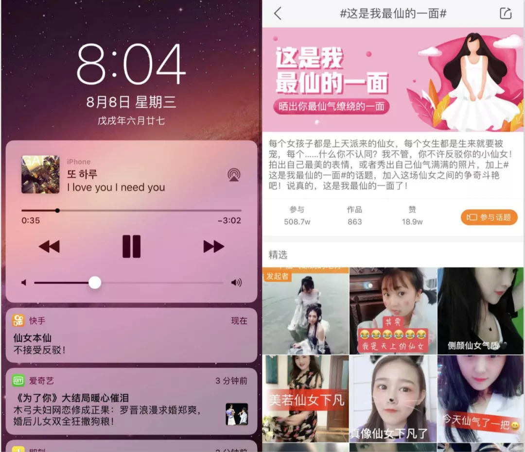再说弹窗,近两周以来,刺猬君收到过快手的两次运营内容弹窗(好友消息、关注博主更新弹窗等不算在内),8日当天主题是“仙女本仙 不接受反驳!”,点开发现其实是一个标签内容的推荐,鼓励更多用户参与到活动之中。