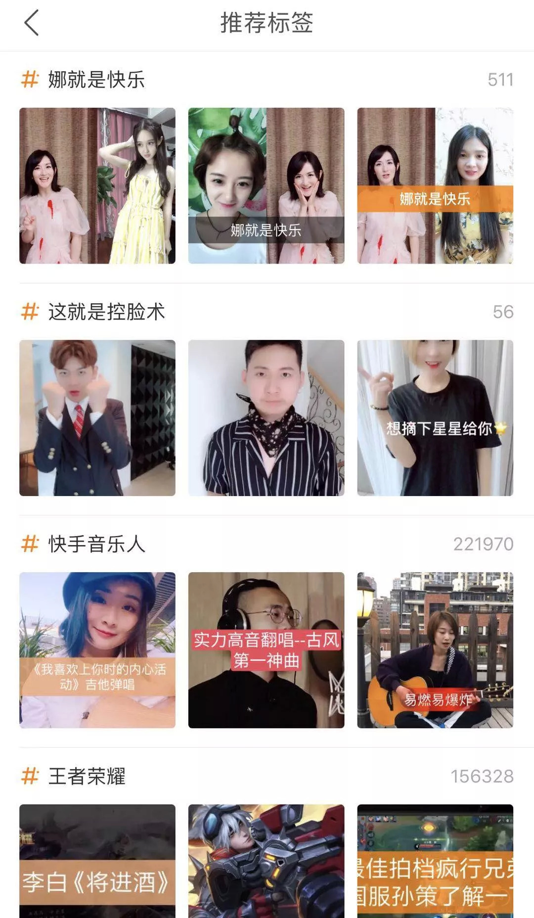 快手的热搜被命名为“标签”,目前“娜就是快乐”“这就是控脸术”“快手音乐人”“王者荣耀”等标签出现在快手推荐标签榜靠前的位置,不管和抖音还是微博的热搜相比,快手的标签榜链条都显得过于长,抖音设置为30个热搜,微博设置为50个,快手并未给标签排序,下滑好几屏,也见不到末端标签。