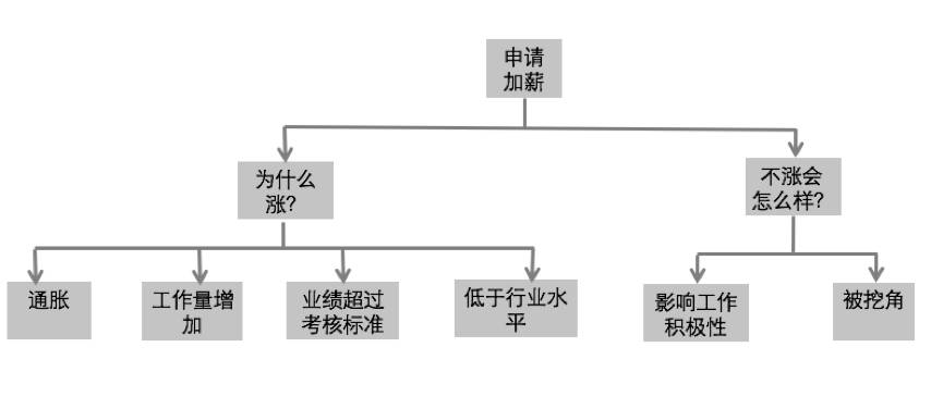 也就是将“我要加薪!!!”变成了“我该不该加薪?”相关的子问题就是“影响我加薪的因素有哪些?“要尽可能列举所有原因,越是全面,那在与老板沟通之后,获得加薪的概率也就越高。