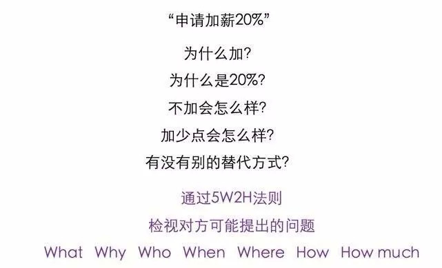 或者我们可以从老板的立场出发思考,也就是“如果我希望加薪,老板会提出哪些问题?”我们可以通过常用的5W2H法则来提前预测老板可能提出的疑问。