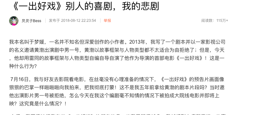 但8月12日,编剧于梦媛在微博上称“实名举报黄渤新戏 《一出好戏》抄袭”,在题为《《一出好戏》别人的喜剧,我的悲剧》长文中,于梦媛称自己2013年完成的剧本《男人危机》曾递交给黄渤,被黄渤方面以“故事题材与人物角色都不太合适”为理由拒绝。于梦媛展示了该剧本于2013年9月29日获得的拍摄许可证,并从故事类型、核心创意、主要人物、故事框架和故事发生地五个方面进行了相似度对比,认为《一出好戏》抄袭借鉴了《男人危机》剧本中的故事创意与框架,并表示目前正在积极地收集整理证据材料。