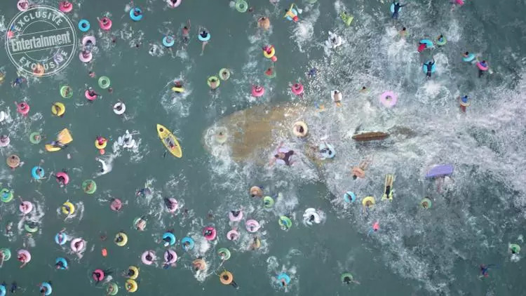 海中密集犹如“煮饺子”般的游客与在他们脚下游动的巨齿鲨,先不说“怎么没有搁浅”,仅从画面冲击度来看,足以在同类影片中遥遥领先。