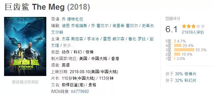 《巨齿鲨》目前在豆瓣的评分是6.1,抱着“只看鲨鱼”,做了3分片心理准备的观众,在竟然还不错的超预期惊喜中,给了它“比《谜巢》好了100个《鲨卷风》”、“比预想好很多,惊悚感和紧张感都有”等等好评,也让《巨齿鲨》票房由此逆袭。