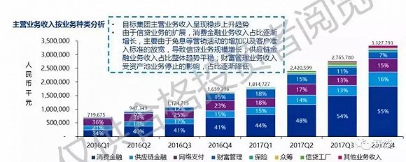 不过,目前京东金融主要来自于自身的消费金融产品,即白条和金条。一份网络上流传的京东金融推介材料显示,到2017年第四季度,消费金融业务已经占到了总收入的55%。不过,这一数字并未得到京东金融官方证实。