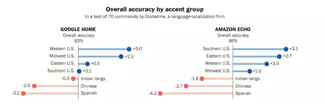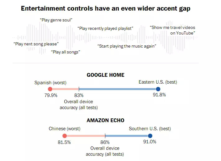 最近,华盛顿邮报与Globalme和Pulse Labs两家语言研究公司合作,对搭载了语音识别技术的智能音箱设备的口音问题进行了研究,研究范围来自美国近20个城市、超过100名参与者发出的数千条语音命令,结果显示,这些系统在理解来自不同地区的人的语言时存在显著差异。
