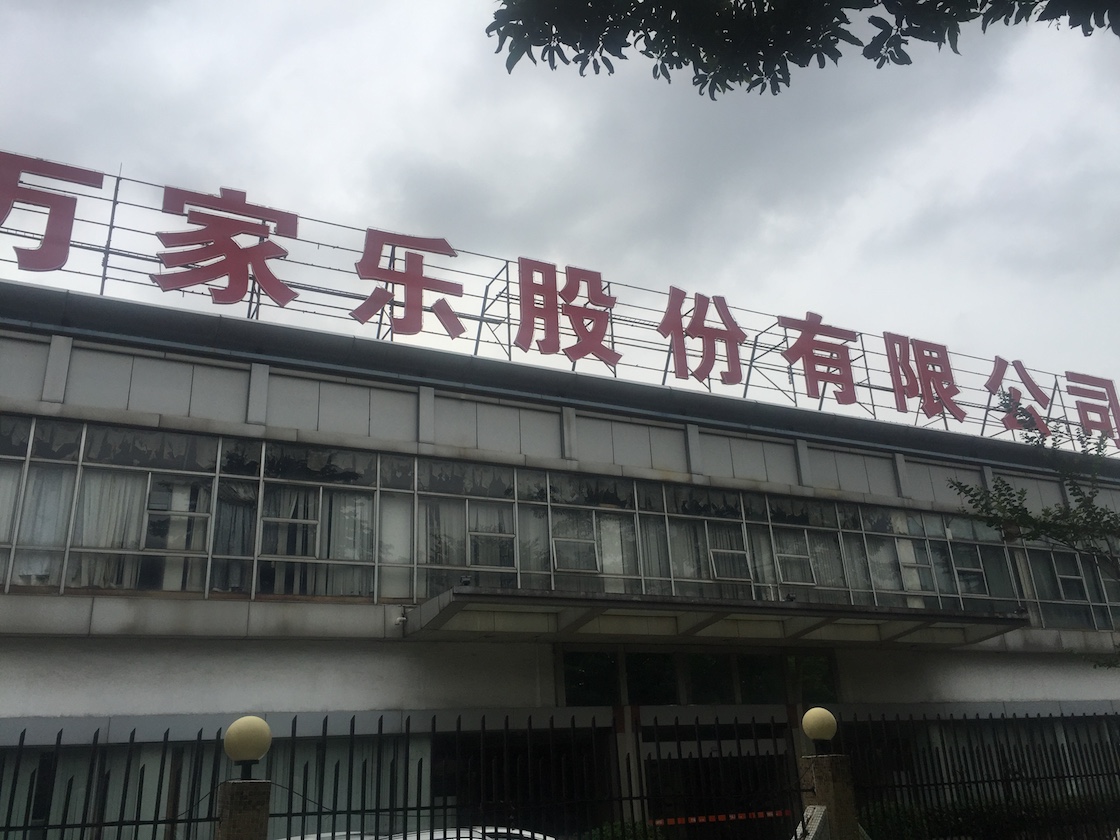 佛山顺德,万家乐燃气具大门旁陈旧的两层楼房上,仍竖立着“广东万家乐股份有限公司”字样,二楼窗户透出稀疏破败的窗帘。厂房围墙贴着的仍是90年代流行的马赛克瓷砖,下方连续出现的大洞被水泥和砖块马马虎虎地封了起来。