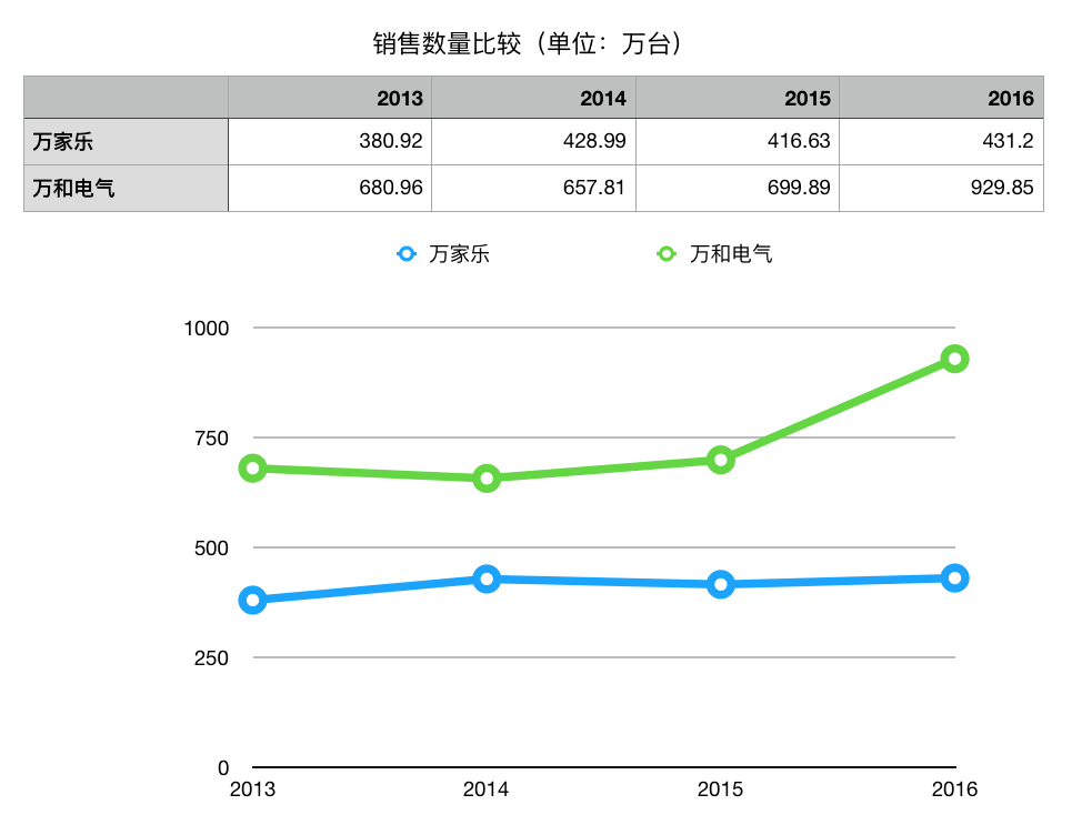 不过,万家乐品类单一,也并未在电热水器上花太多功夫,其销售量也十分一般。在2013年-2016年间,万家乐厨卫电器最高销量是2014年的428.99万台。而万和电气同期的销售量为657.81万台。随后的两年里,万家乐厨卫电器的销量停滞在416万-431万台,而万和电气的销量则持续上涨,在2016年达到了929.85万台。
