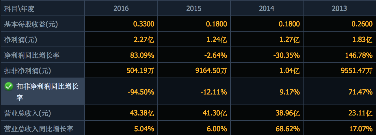 燃气具厨电产品的竞争力下降最终反映在了财务报表上,万家乐的业绩也变得不那么稳定。2013年至2016年期间,万家乐的营收虽然有所上涨,但增长率却在快速下滑,分别为17%、69%、6%以及5%。净利润增长率也出现明显下降,2013-2016年,由147%的增长率下降至-30%、-3%,虽然2016年增长率达到了83%,但细看之下,其扣非后净利润仅为504.16万元,同比减少95%。