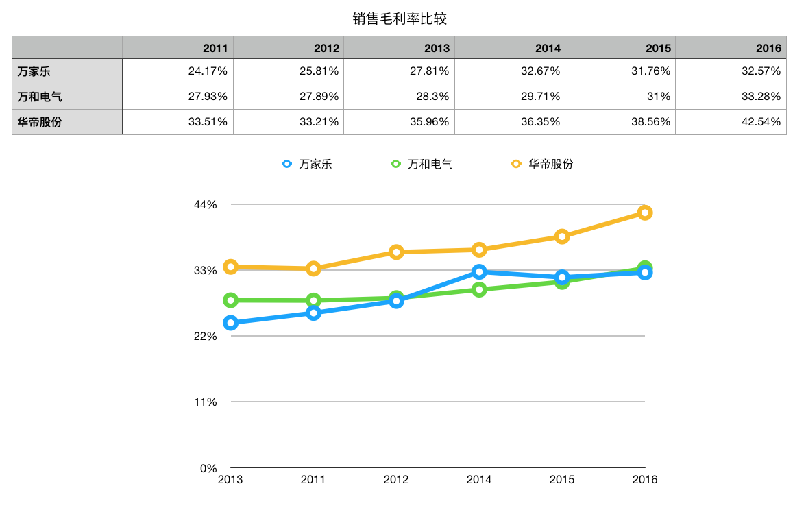 相比同样位于广东且同为燃气具生产厂商的万和电气(002543.SZ)与华帝股份(002035.SZ),万家乐燃气具毛利率表现并不如后两家公司稳定,在远低于华帝股份的同时,也渐渐被万和电气超过。总体上看,万家乐燃气具的毛利率表现低于后两者。