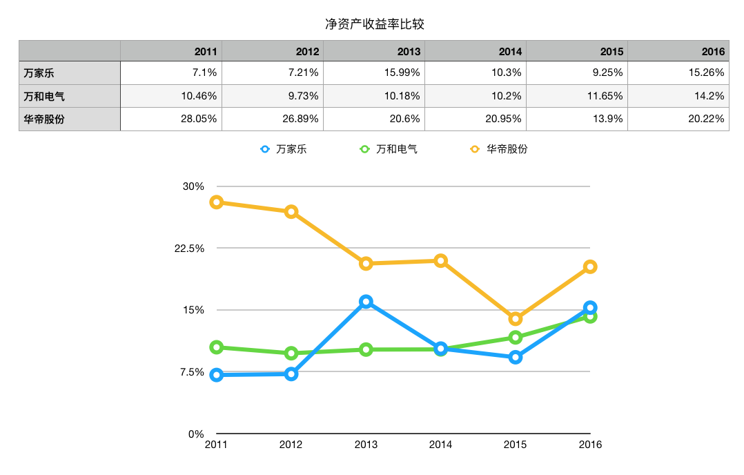 作为衡量上市公司盈利能力高低的重要指标,净资产收益率上,万家乐与万和电气、华帝股份之间也存在着一定的差距。总体看,大幅低于华帝股份,并且波动较大。