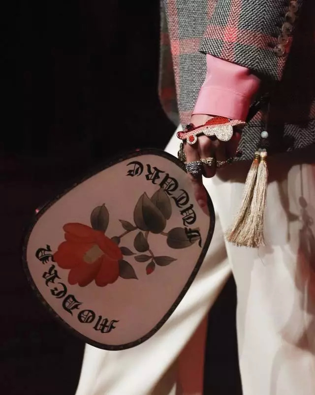 Gucci去年出过一把扇子,东方风格的印花很有韵味,和欧洲哥特体字母标语搭在一起,有种「冲突又和谐」的别样美感。
