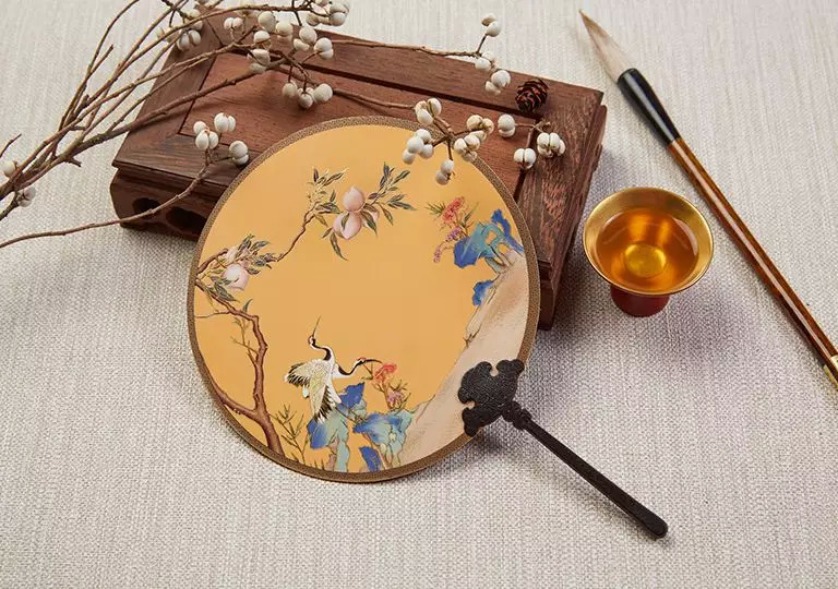 皇后所用之扇,仿制的是清朝的“黄色纱贴绫绢桃树双鹤图染雕骨柄团扇”,原扇现收藏于故宫博物馆。