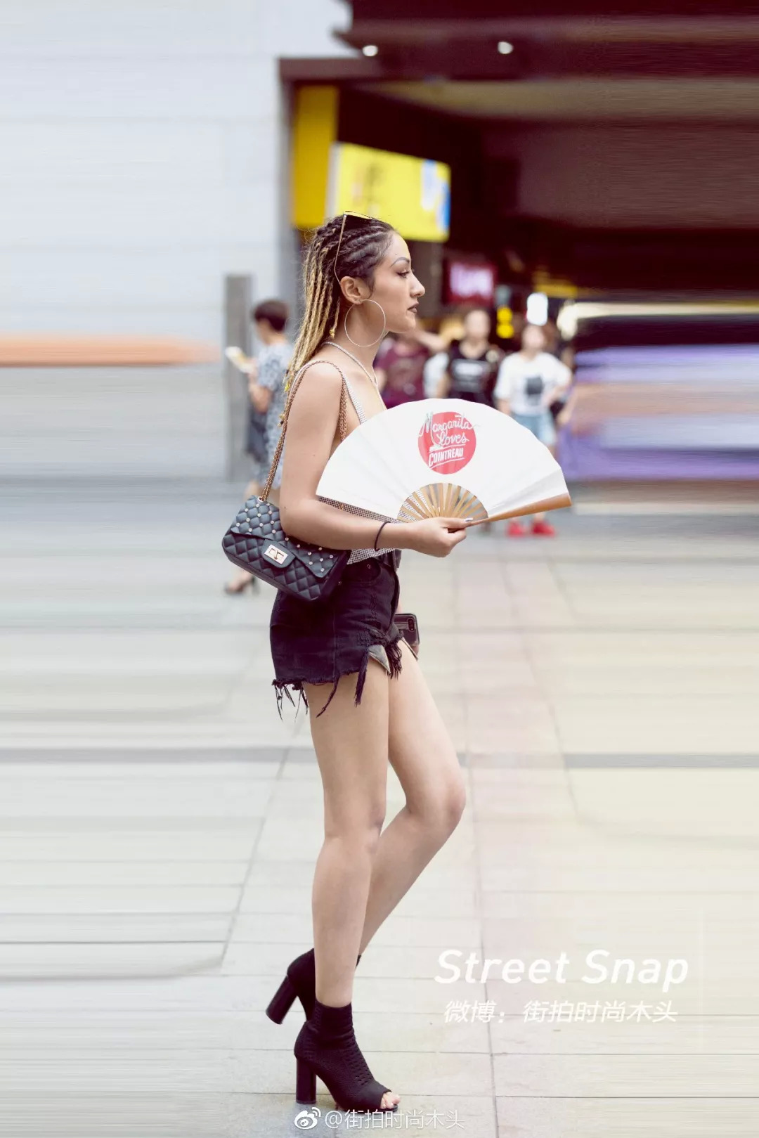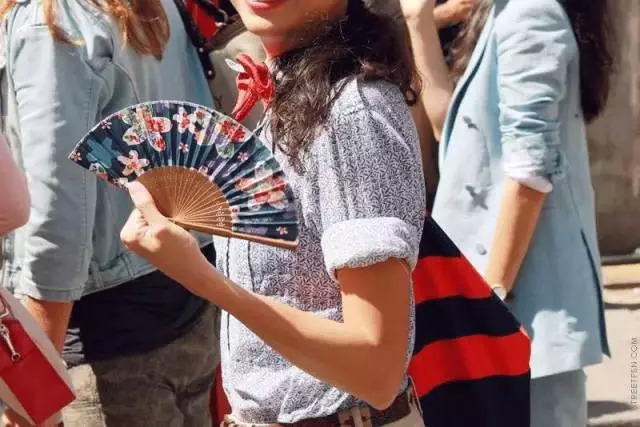 街拍手上的道具可以不再是手包,拿起折扇才是人群中最抢眼的。
