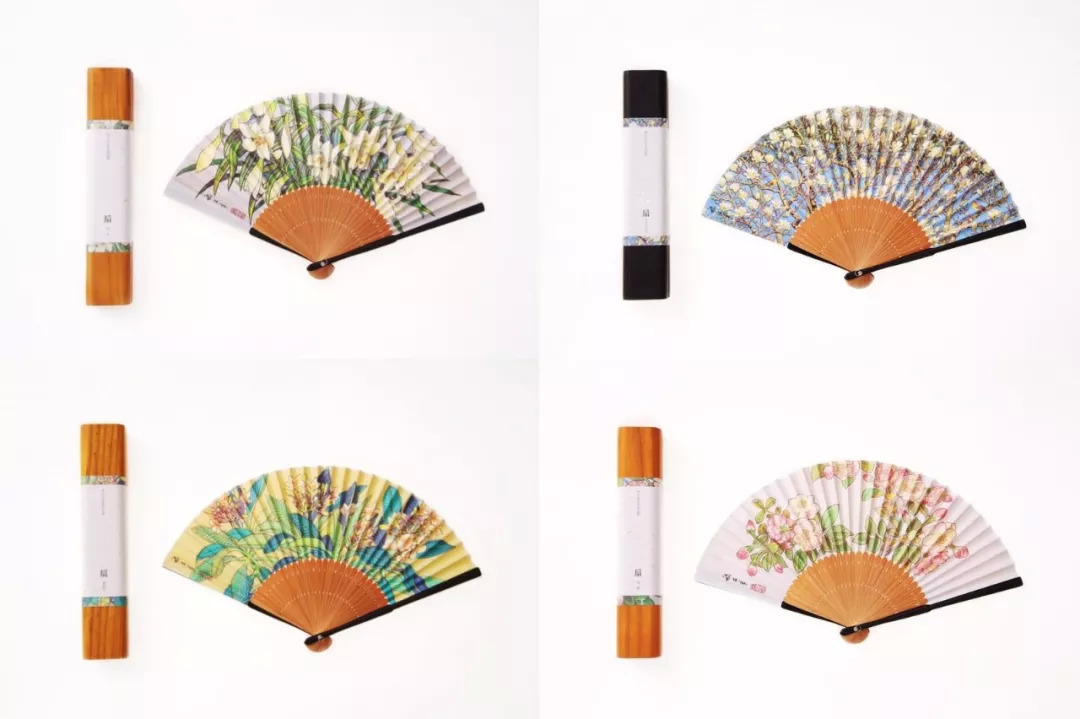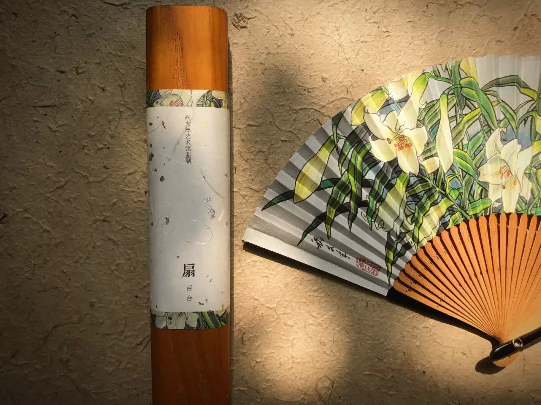 折扇一共有4款,扇面分别采用了祝大年的4幅花卉工笔重彩画——《玉兰花开》《百合》《海棠》《缅栀子》。繁复的花朵,色彩清丽,韵味悠长。