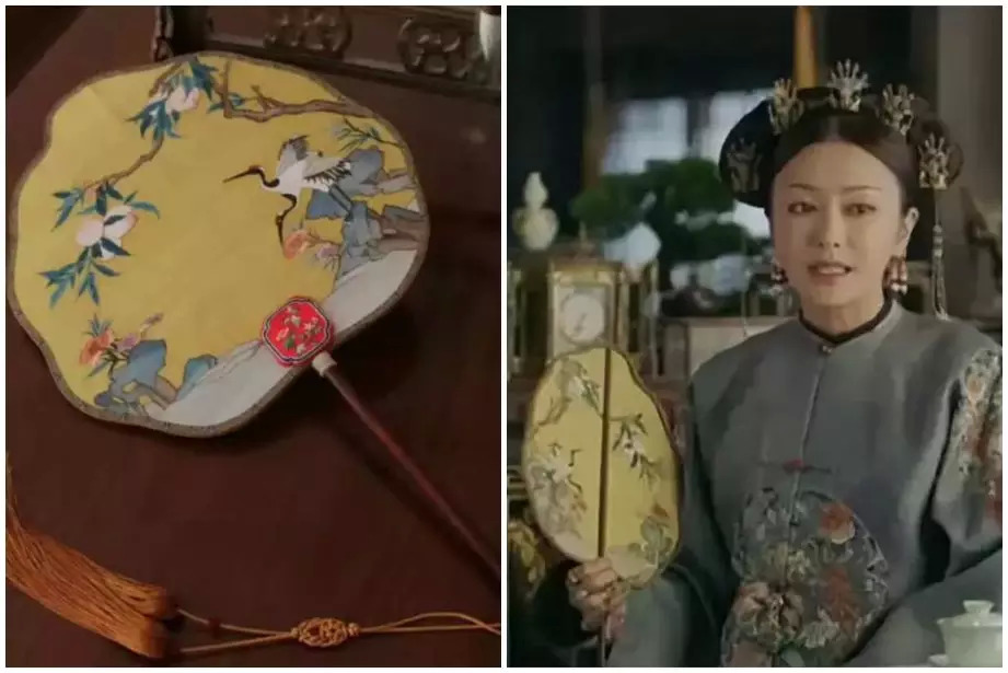比如太后所握团扇,就是仿制清朝“纱面贴绢仙鹤桃树图团扇”。