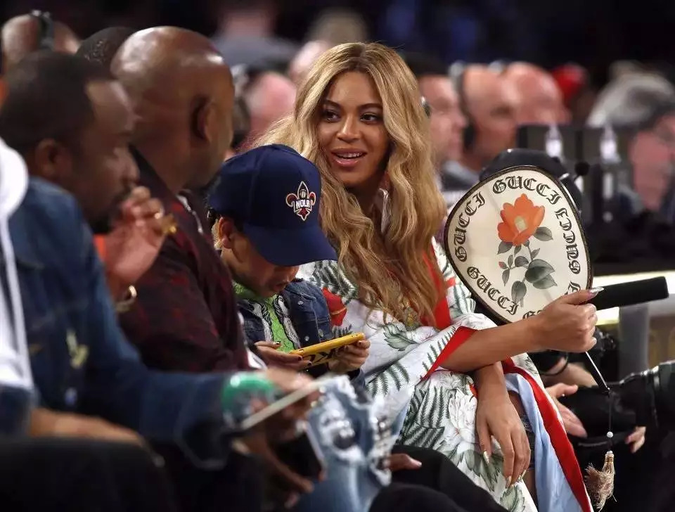 作为 Gucci 死忠粉丝,Beyonce 对这把扇子也是爱不释手,去 NBA 现场看球都不忘带着。