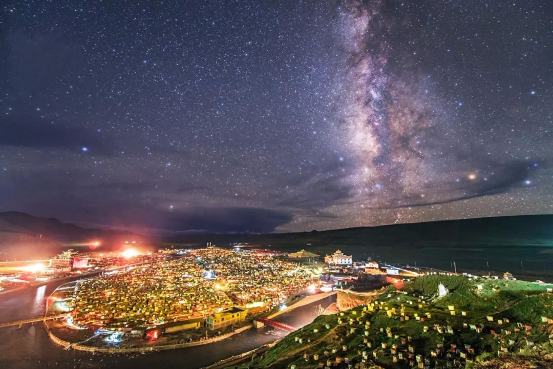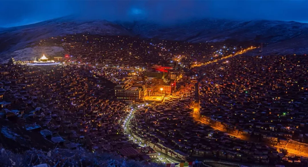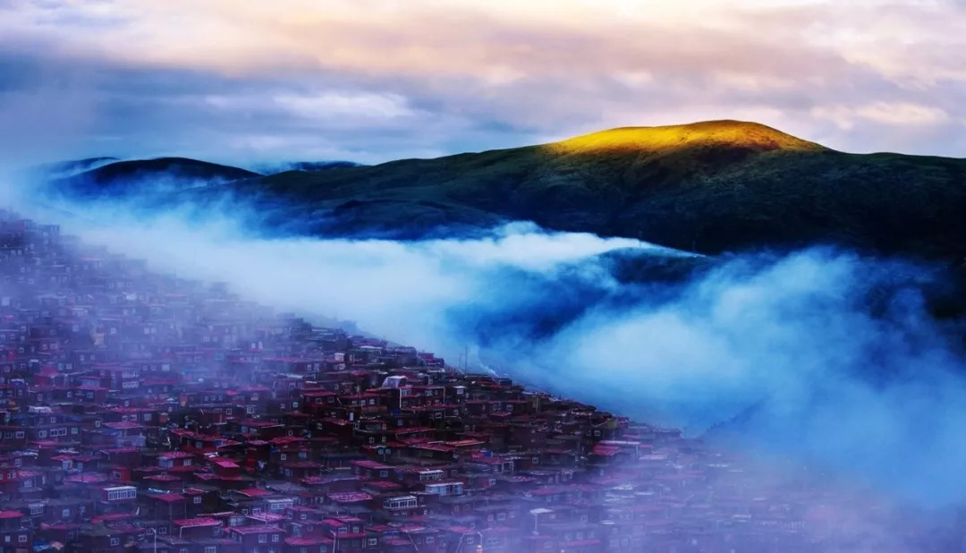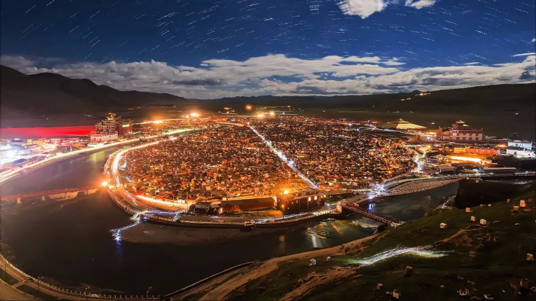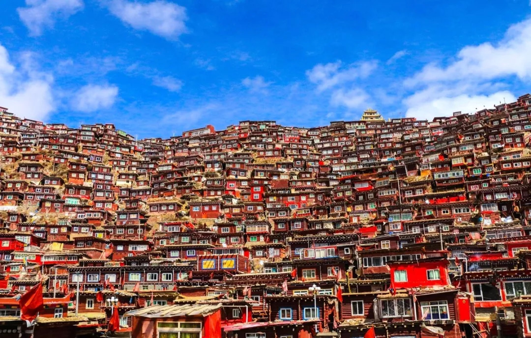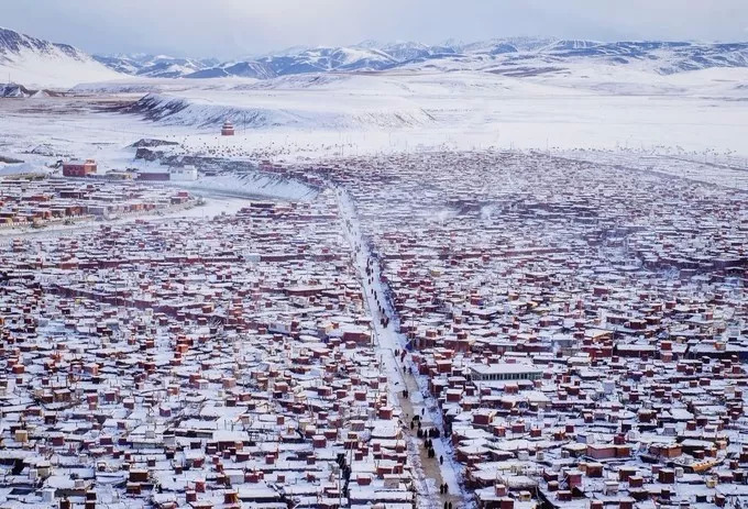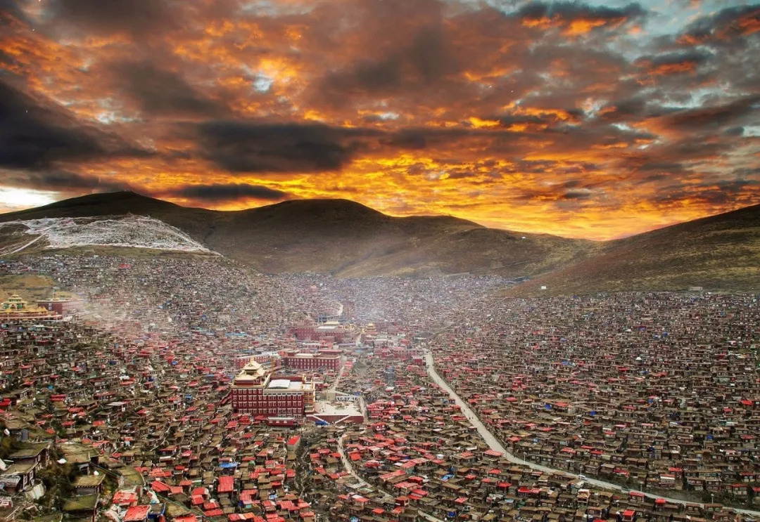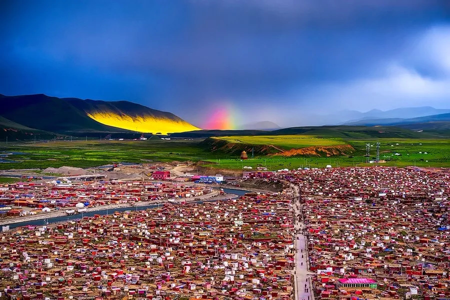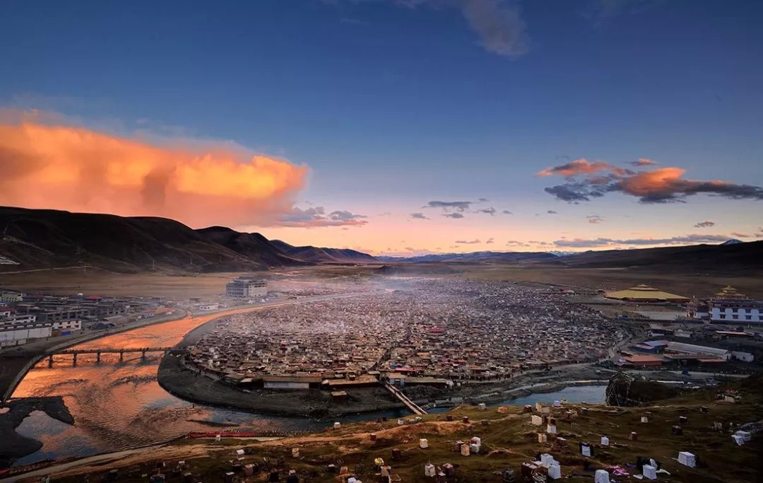 亚青寺建在四面环山的草原湿地上,有数千间信徒居住的小木屋,纵横交错的河流包围了整个寺庙的建筑群。