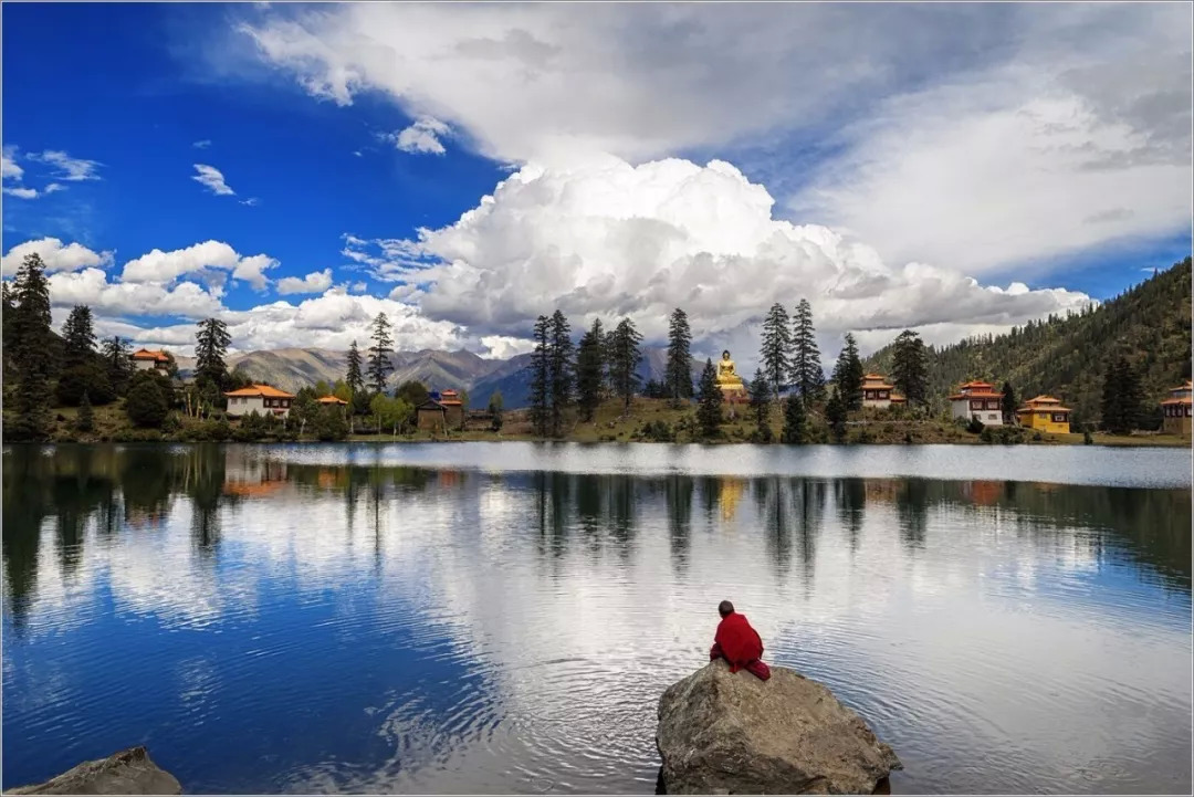 措卡湖不是很大,但碧玉般的湖水却收集着蓝天、白云、绿树、红寺庙的身影,仿佛整个世界都被她揽入怀里。
